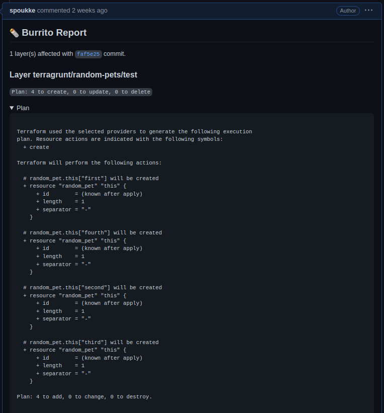 It is responsible for creating temporary TerraformLayer resources linked to the Pull Request it was generated from. Once all the TerraformLayer have planned, it will send a comment containing the plan results to the pull request.